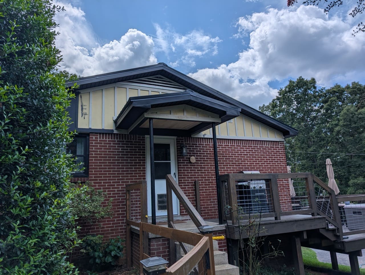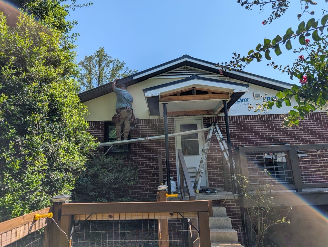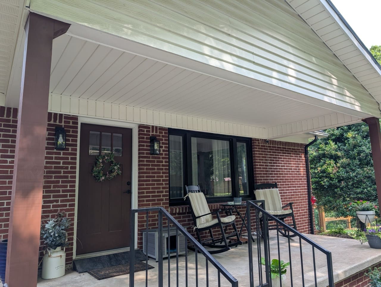 Before the work started, the home had a mix of finishes that didn’t quite work together. The gables were plain and lacked detail. The porch ceilings were standard vinyl. The gutters and soffits were white and didn’t connect visually with the rest of the house.