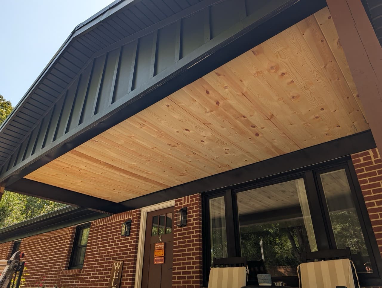 - Wood ceilings add warmth and make covered spaces feel finished.