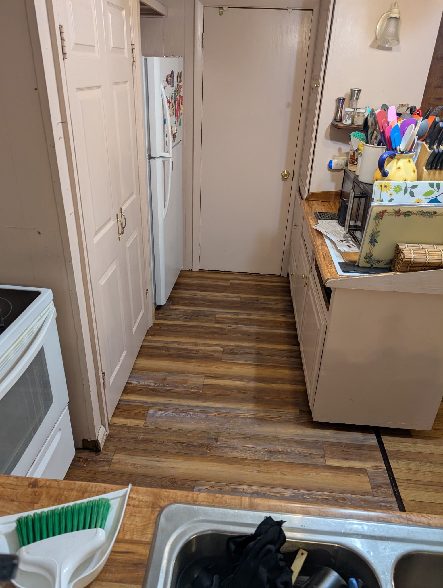 Once the structure was solid again, we moved into finishing the space. The homeowners chose a waterproof vinyl plank flooring, which is a smart option for kitchens and utility areas. Vinyl plank resists moisture, cleans easily, and holds up well to daily wear. It also provides a clean, finished look that works with a wide range of home styles.