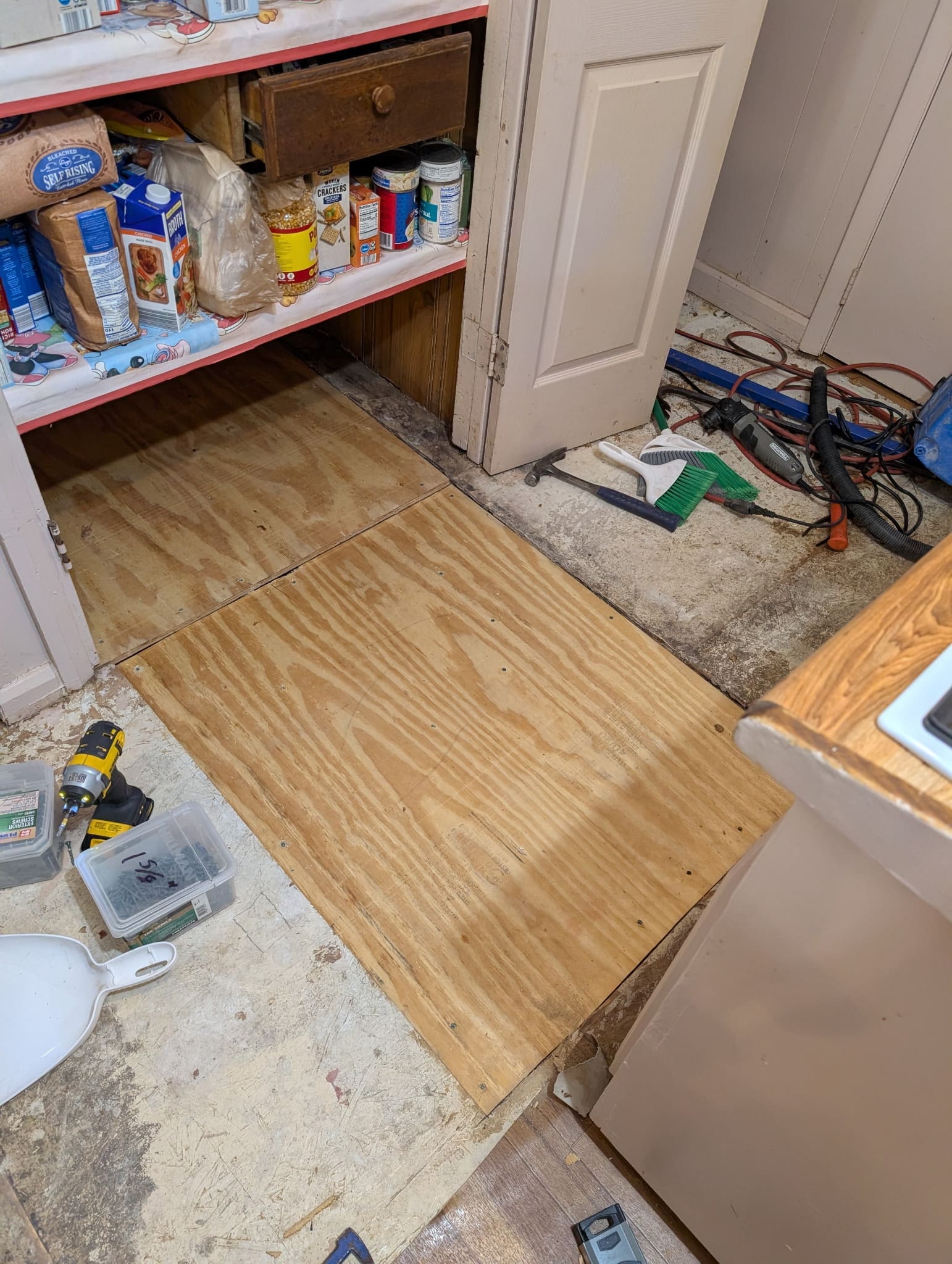 After demolition, new plywood subfloor panels were installed and securely fastened to restore strength and stability. The floor was carefully leveled to ensure a smooth transition between rooms. Proper fastening and alignment are critical, especially in smaller spaces like kitchens where appliances, cabinets, and foot traffic concentrate weight in specific areas.